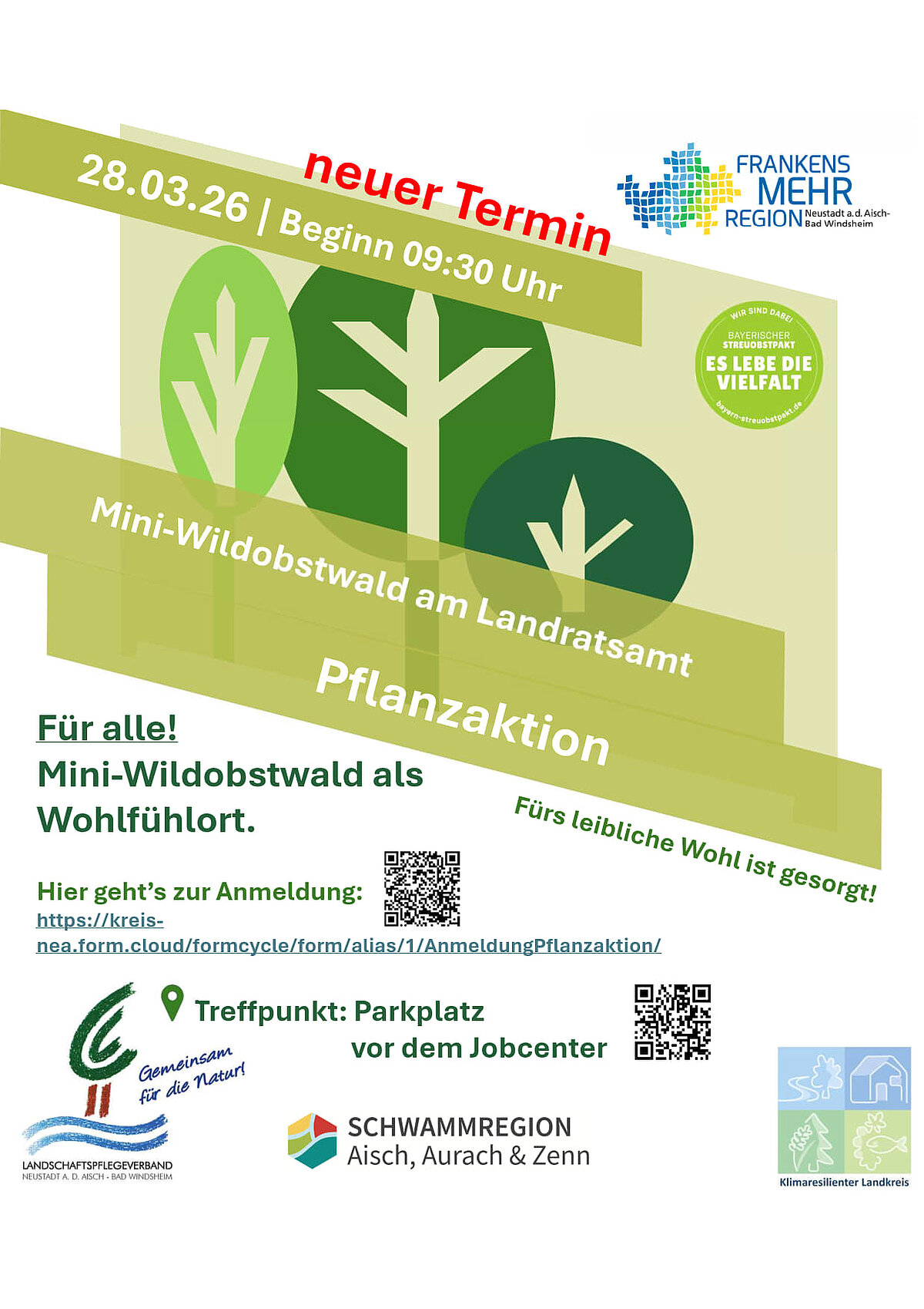 Das Landratsamt Neustadt a.d.Aisch-Bad Windsheim lädt gemeinsam mit der Sparkasse zur gemeinschaftlichen naturpädagogischen Pflanzaktion eines Miniwildobstwäldchen am Jobcenter am Samstag, 28.03.2026 ab 09.30 Uhr ein.
